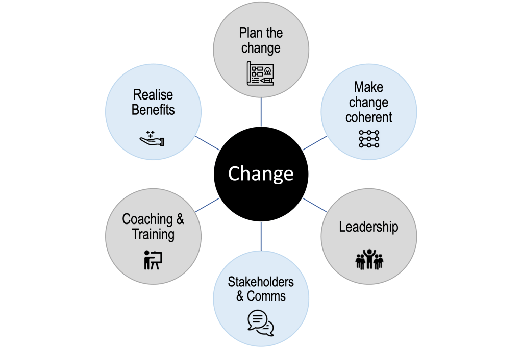 People are generally creatures of habit, hard-wired to resist adopting new mind-sets, practices, and behaviours. To achieve and sustain change, we support individuals within an organisation to embed new mind-sets, practices, and behaviours – and that takes time. We take a benefits-focused approach, meaning we begin with the end in mind and ensure we speak the language of those who will be impacted, answering the “what’s in it for me?” question.